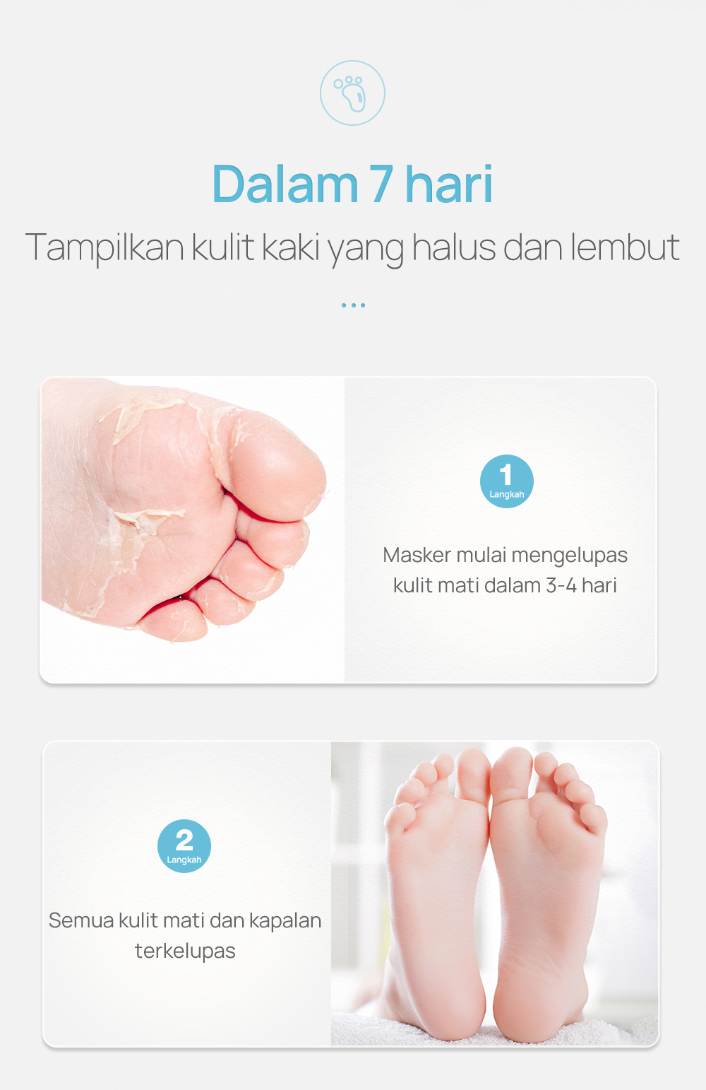 Langkah 6 : Setelah digunakan 3-7 hari, kulit mati akan mulai terkelupas dari kaki anda. (Proses mengupas akan berakhir setelah 10 hari penggunaan).
